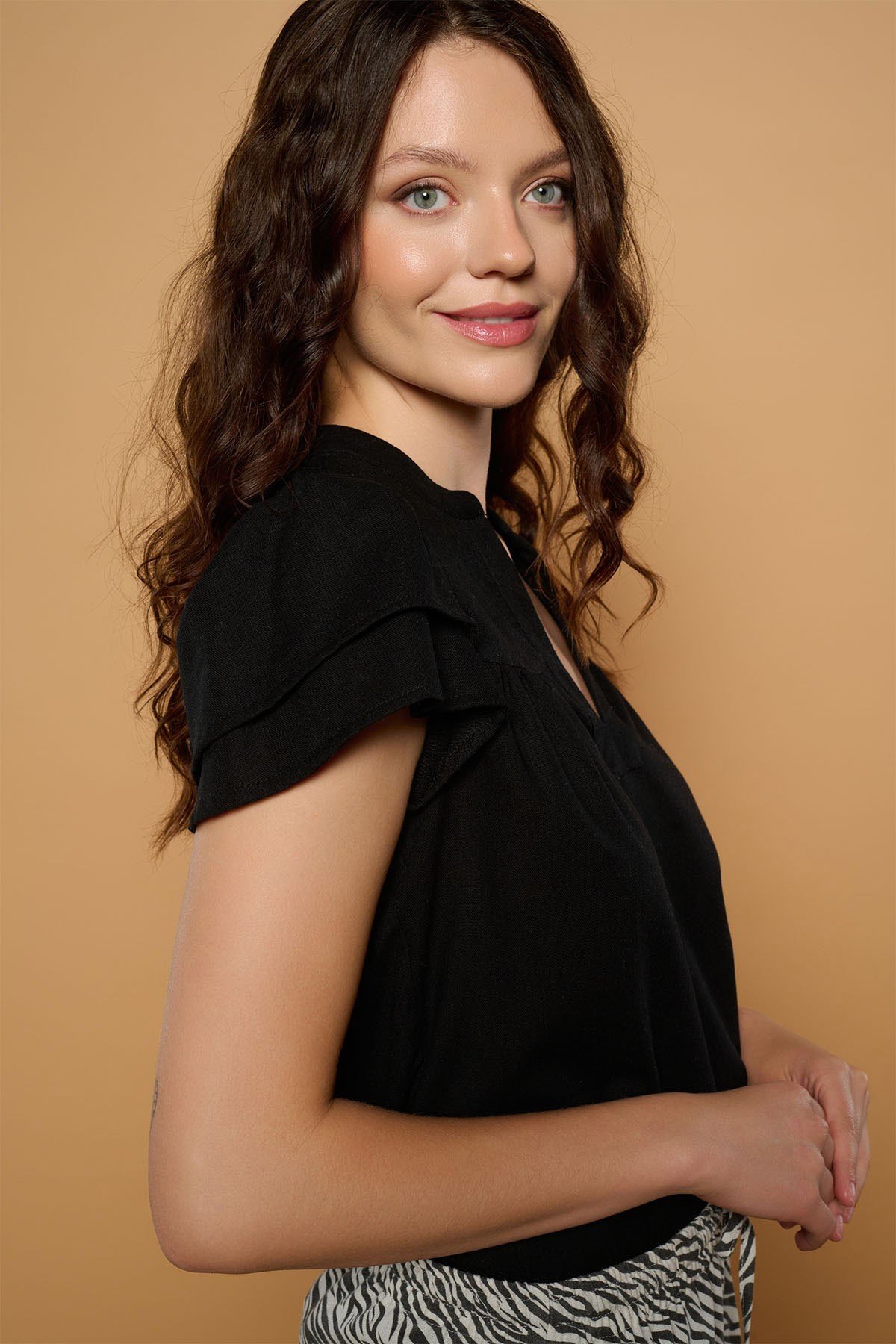 Blusa de cuello mao con escote en pico y manga corta. Detalle de doble volante en las mangas. Color negro. Bordado de tigres, rayos y llamas en espalda. Tejido mezcla con lino.