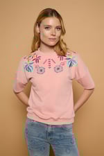 Camiseta de cuello redondo y manga al codo. Detalle de flores y hojas bordados en hombros y pecho. Tejido mezcla de algodón. Cuello, bajo y mangas en rib.