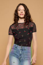 Camiseta de cuello redondo y manga corta. Tejido elástico de tul semitransparente de color negro con estampado de cerezas rojas.