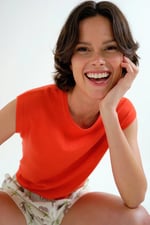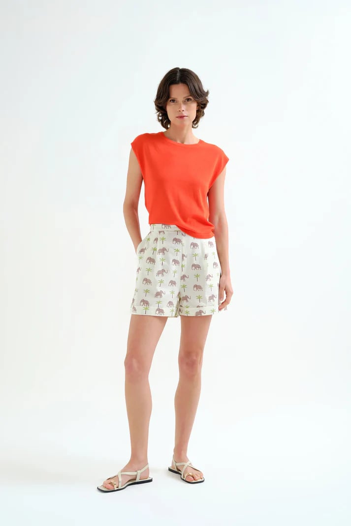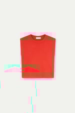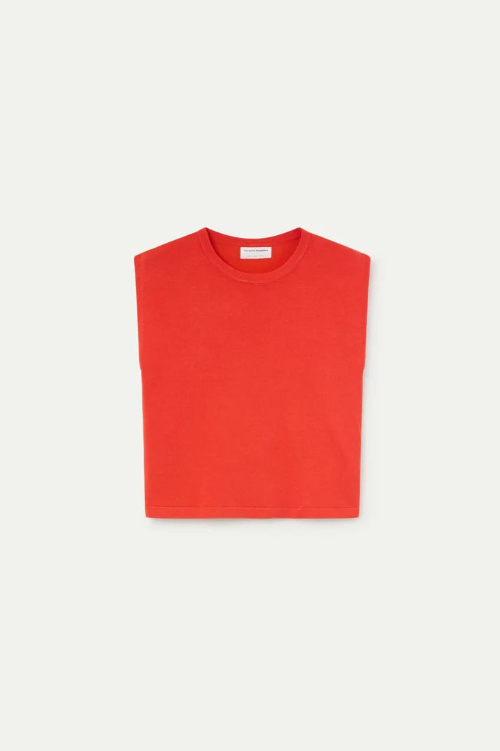 Top con tejido punto de color naranja. Cuello redondo y sin mangas. Detalles acabados en rib. La modelo mide 177 cm y lleva la talla S.