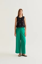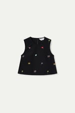 Top de tejido 100% algodón con estampado black gardener flowers. Cuello redondo y sin mangas. Cierre posterior con botón oculto. La modelo mide 177 cm y lleva la talla S.