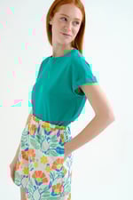 Top de tejido mezcla de color verde. Cuello redondo. La modelo mide 175 cm y lleva la talla S.