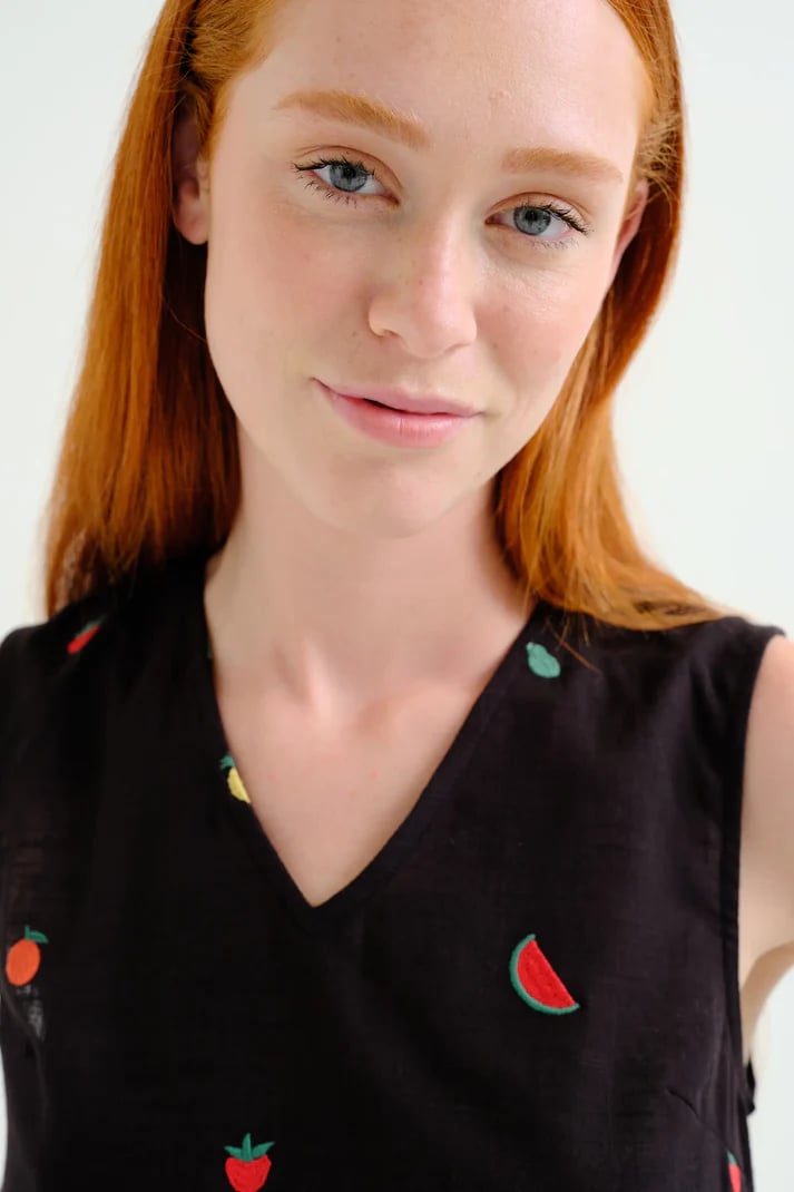 Top de tejido 100% algodón de color negro con bordado de ensalada de frutas. Escote pico y sin mangas. Cierre posterior con botón oculto. La modelo mide 175 cm y lleva la talla S.