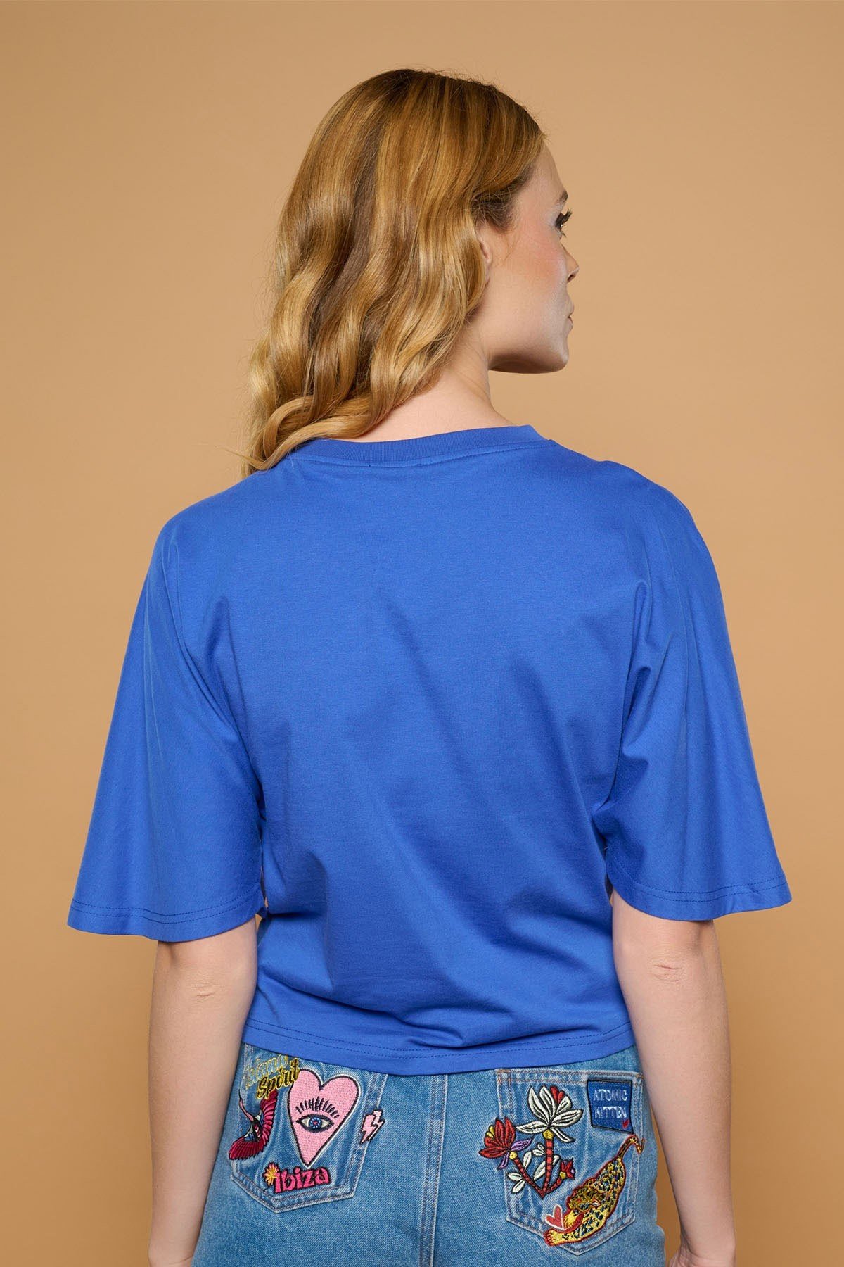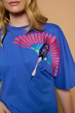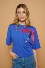 Camiseta de cuello redondo y manga corta acampanada. Detalle de bordado de ave en el lateral frontal con colores a contraste. Silueta fluida.