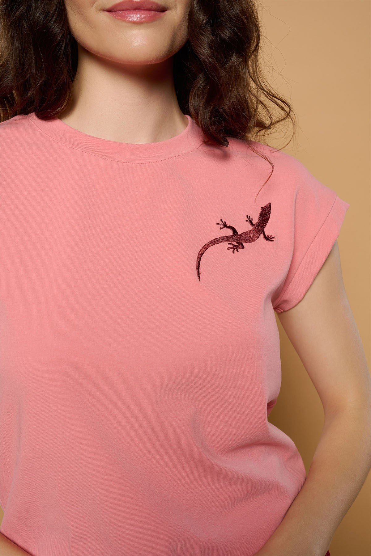 Camiseta de cuello redondo con manga corta vuelta. Bordado de sargantana granate en pecho. Tejido elástico algodón.