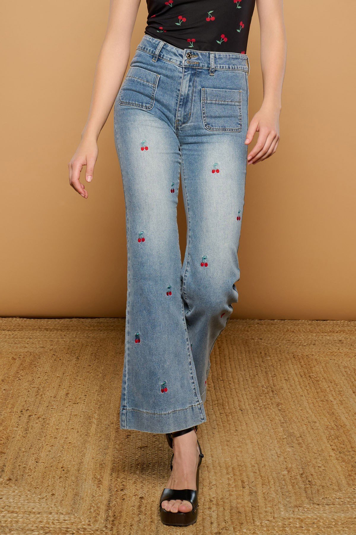 Pantalones vaqueros de tiro alto. Bolsillos sastre en frontal. Cierre con botón y cremallera. Cinco bolsillos. Motivos de cerezas bordados en pernera.