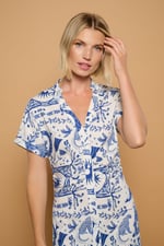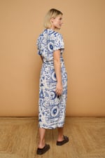 Maxi vestido camisero de cuello mao con escote en pico y manga corta. Cierre con botones frontales ocultos en solapa. Tejido de viscosa y lino.