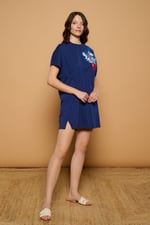 Vestido 100% algodón de cuello redondo y manga corta acampanada. Fit holgado. Bordado de granadas en naranjas y azules en pecho. Pequeña abertura en bajo.