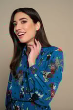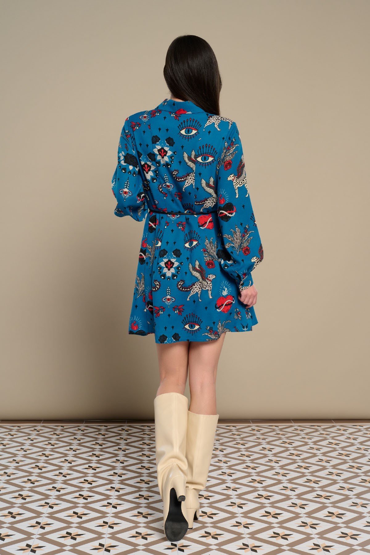 Vestido camisero corto de cuello solapa y manga larga. Cierre con botones delanteros. Estampado gatos alados y corazones. Forro interior. Cinturón incluido.