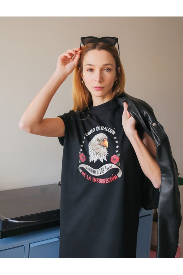 Vestido básico informal, es la combinación perfecta de camiseta y vestido con hombres overcut, minicuello alto y las mangas vueltas.