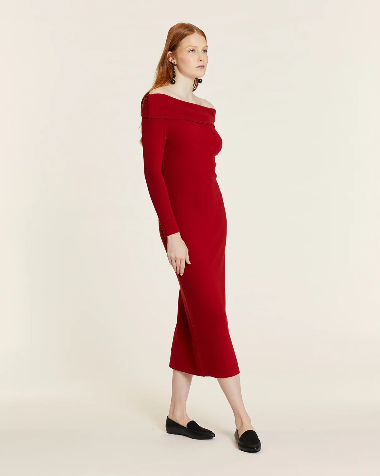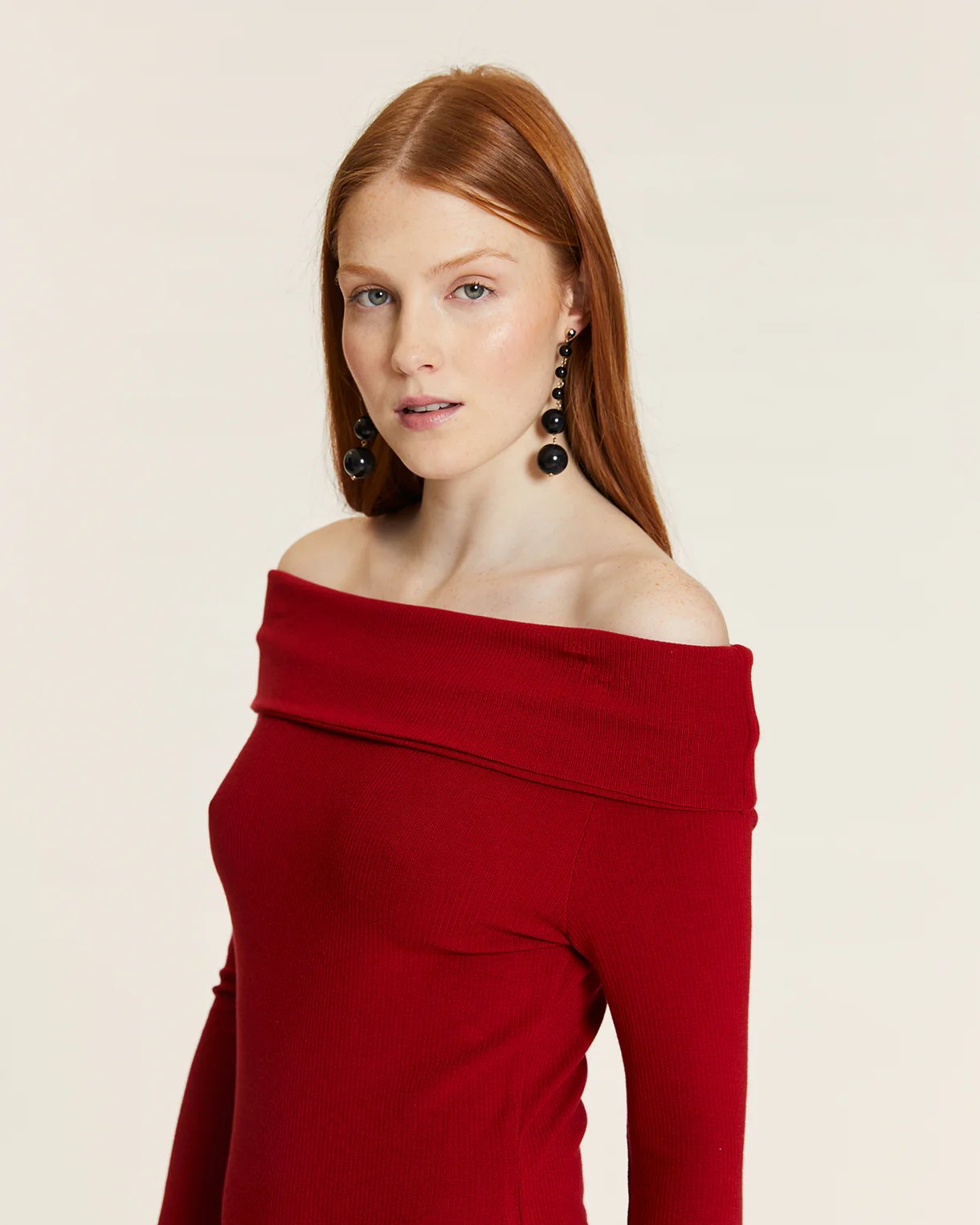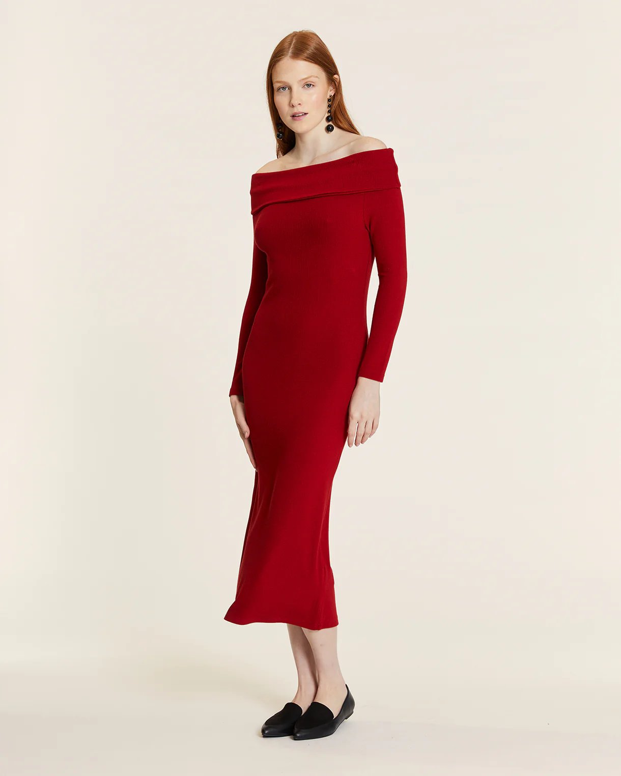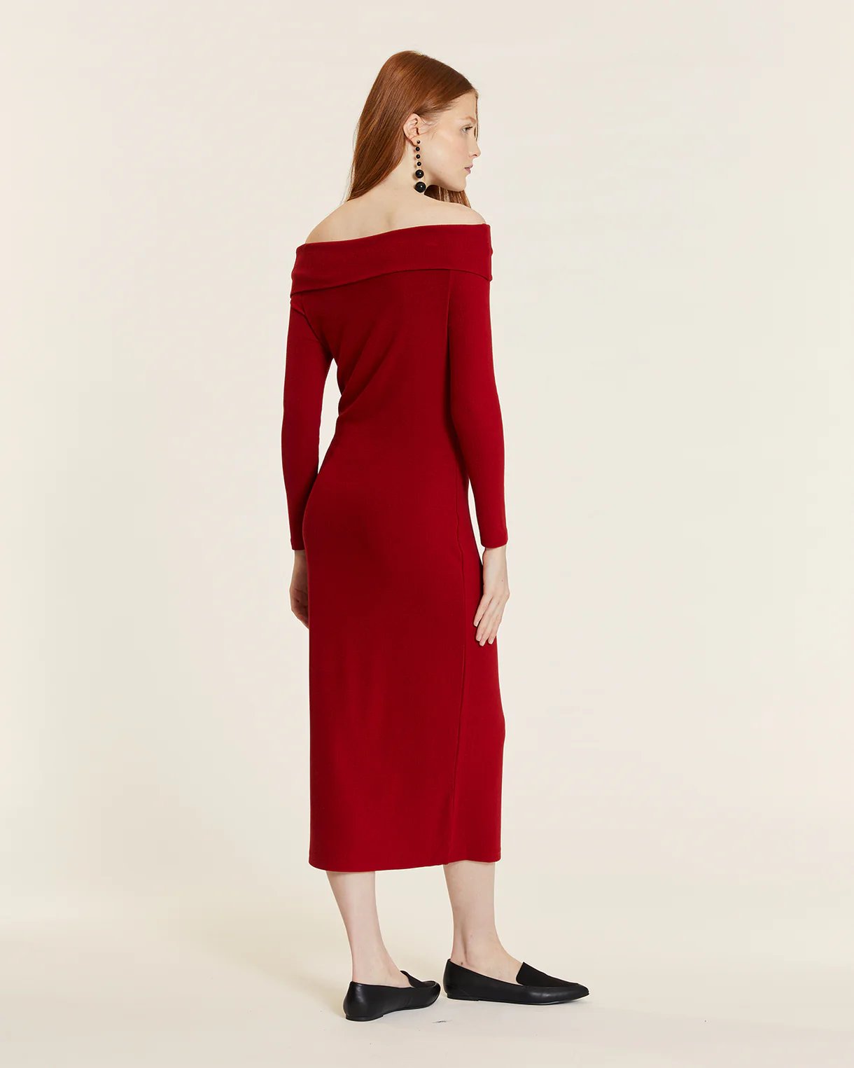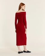 Vestido de canalé, con diseño off the shoulder y mangas largas rectas. Largo por encima del tobillo.