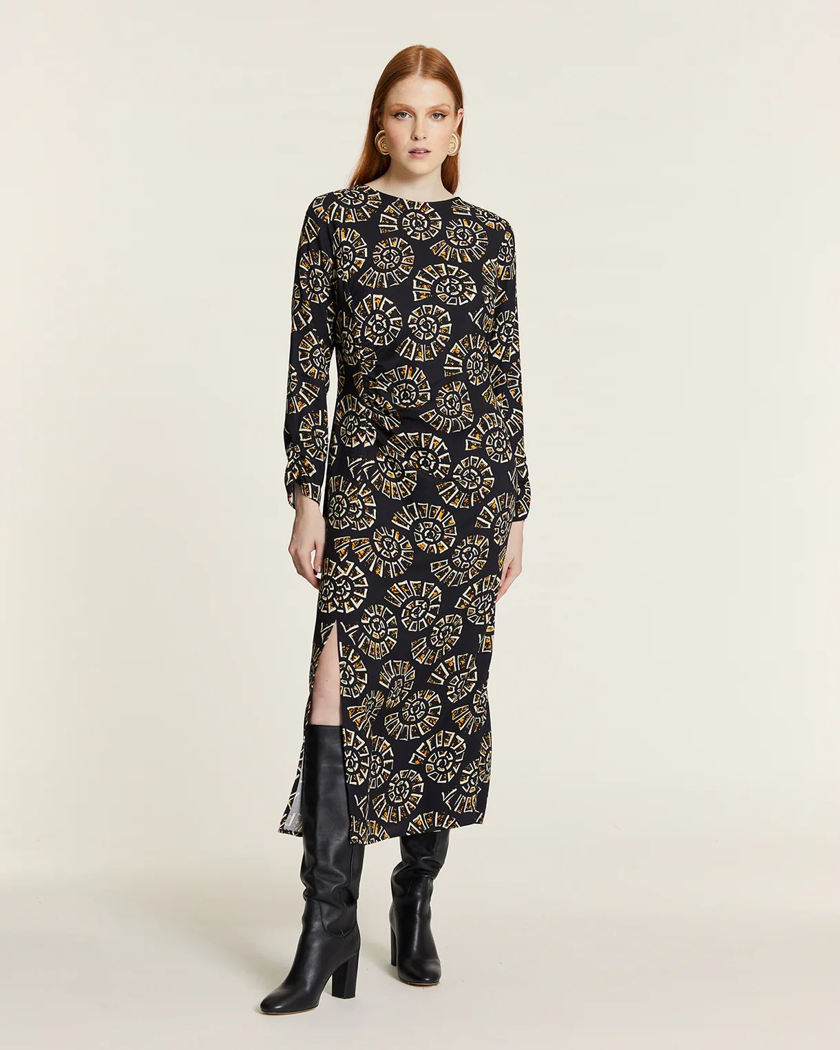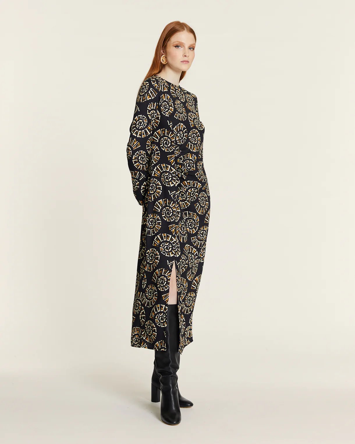 Vestido largo con abertura lateral, pinzas princesa con frunce en el centro del delantero, mangas rectas con frunce lateral en los puños.