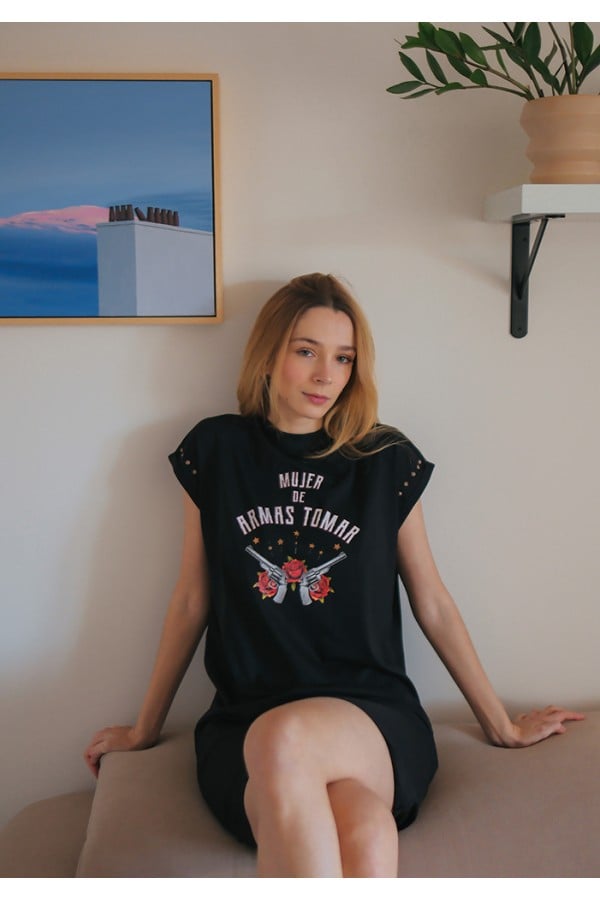 Vestido básico informal, es la combinación perfecta de camiseta y vestido con hombres overcut, minicuello alto y las mangas vueltas.