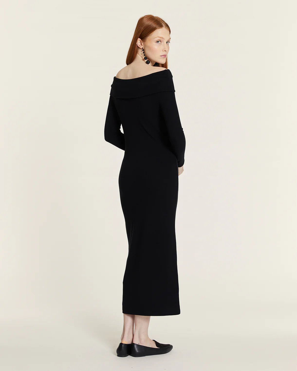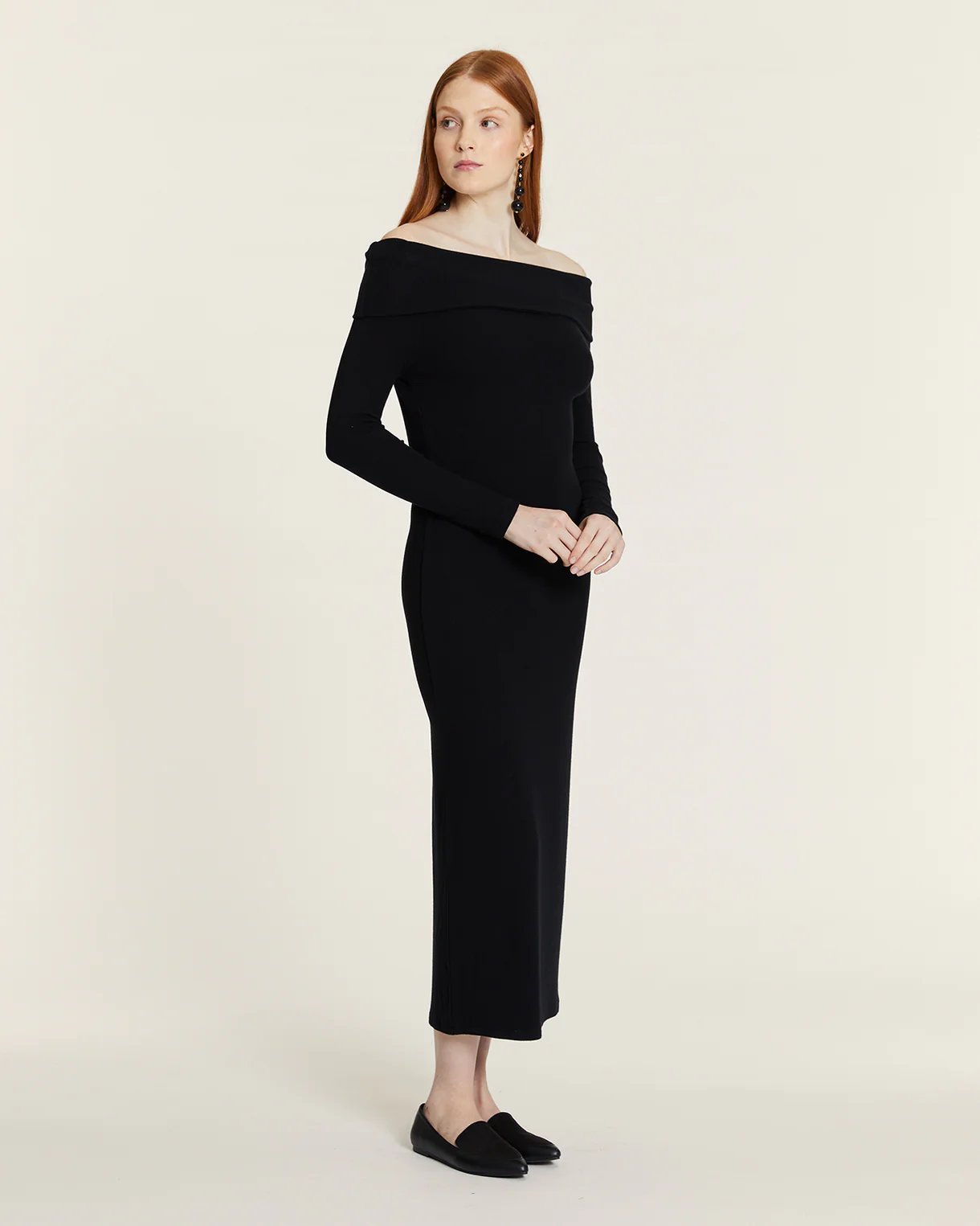 Vestido de canalé, con diseño off the shoulder y mangas largas rectas. Largo por encima del tobillo.
