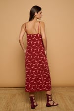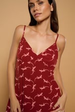 Vestido largo estilo lencero con escote y tirantes ajustables. Bolsillos laterales ocultos. Estampado de sargantanas sobre fondo granate.