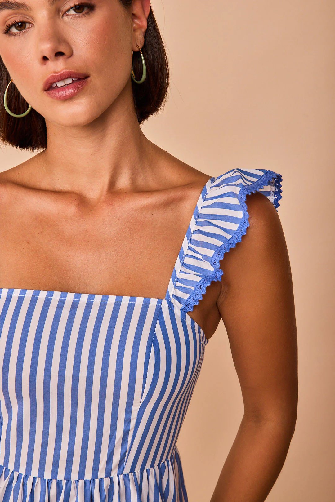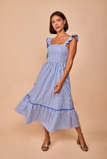 Vestido largo de tirantes con volantes en los mismos, cuerpo pegadito con elástico en la espalda, tiene una puntilla en zigzag que lo hace especial